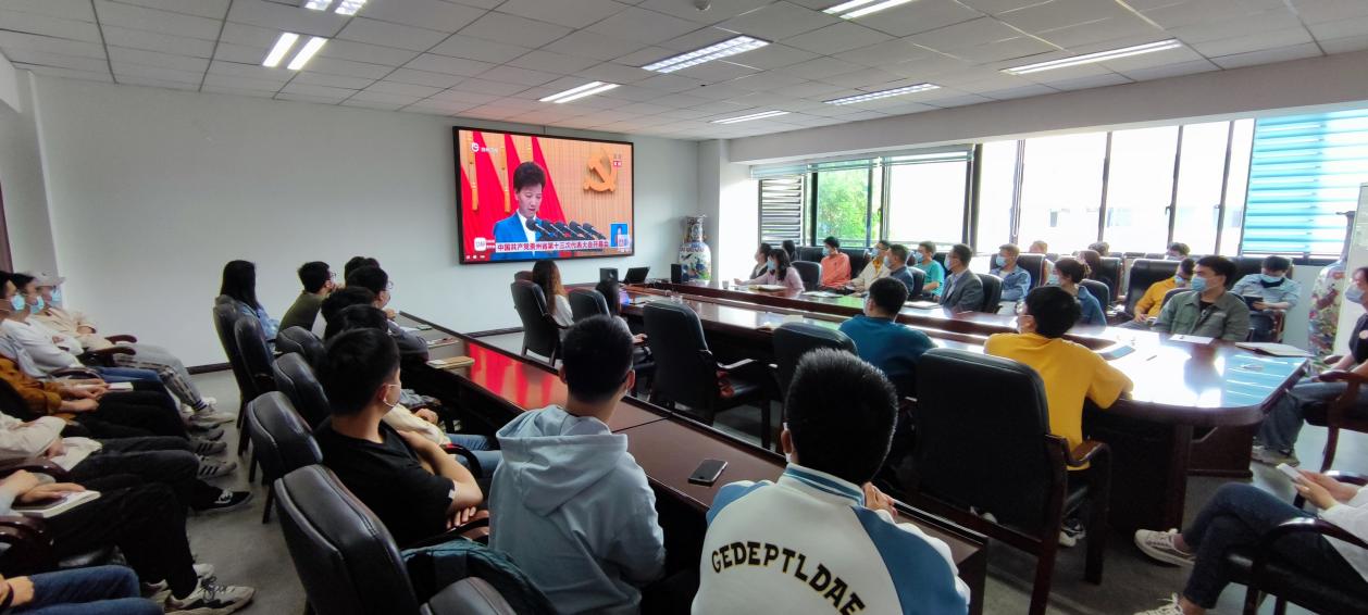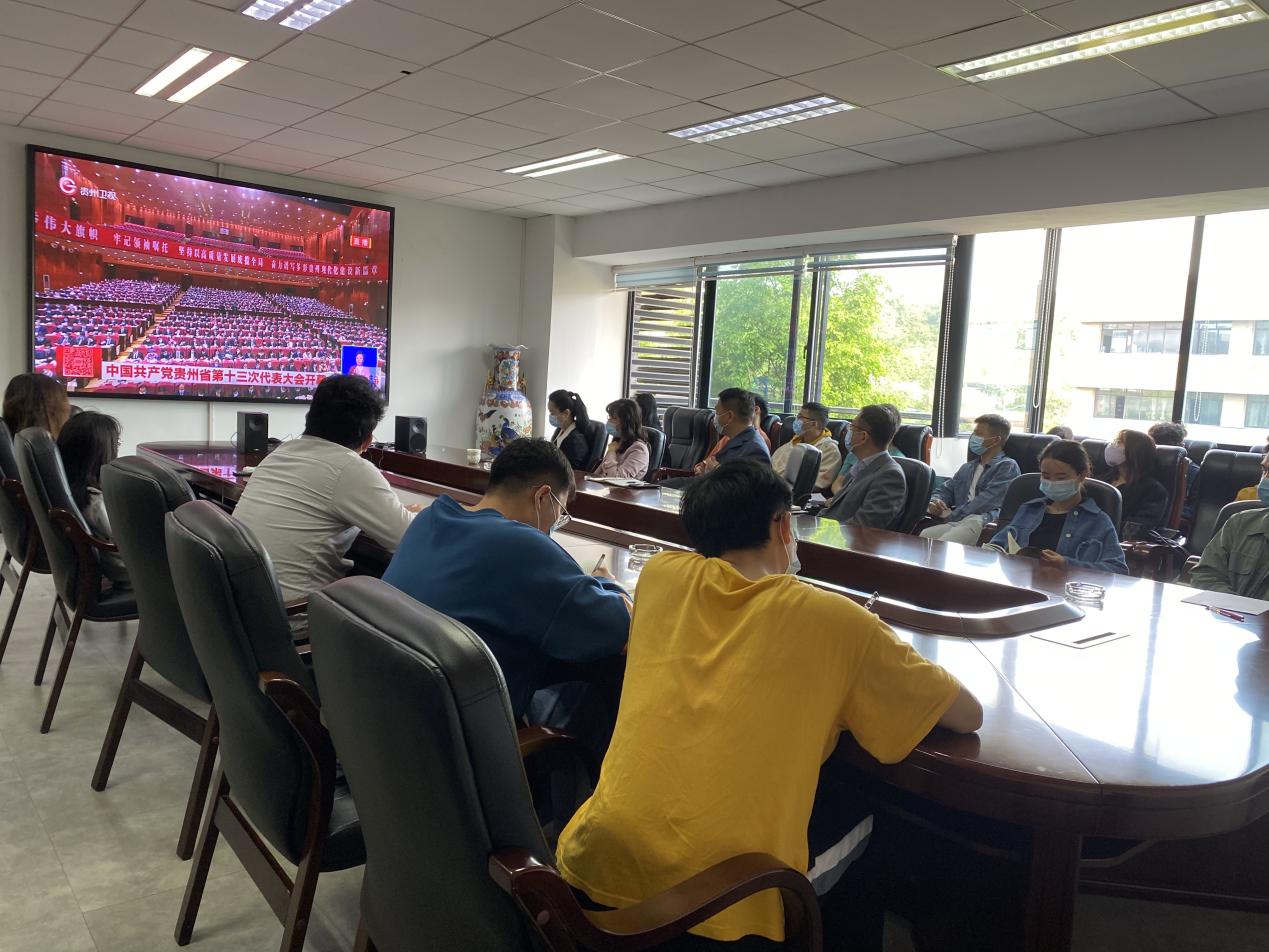 2022年4月25日,williamhill英国官网组织师生集中观看中国共产党贵州省第十三次代表大会开幕会,公司党委书记滕召华、经理赵津、党委副书记廖烨,师生党员代表集中观看、同步学习会议精神。