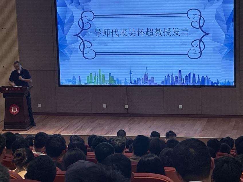 随后,2024级导师代表吴怀超教授为新生们进行了激励发言。吴教授分享了自己多年带员工的心得体会,他强调了以下三点:第一要调整心态,尽快适应研究生阶段的学习和生活;第二要认识自我,培养自己过硬的心理素质和抗压能力;最后要珍惜时间,要对得起自己的青春年华。发言最后,吴教授对新生们表示了欢迎和祝愿,并希望他们在学习过程中勇于探索,积极参与科研项目,不断提升自我。