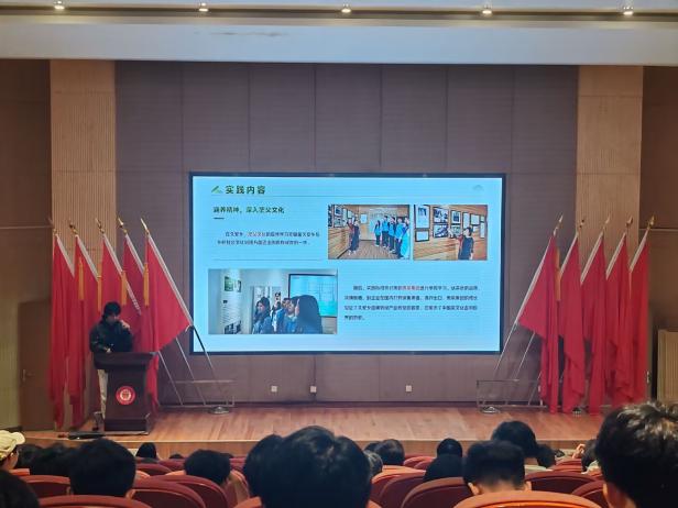 实践育人,彰显资助温度。辅导员杨朵老师对资助政策宣传寒假实践活动进行总结。她回顾了实践活动的开展情况,从活动的组织策划、同学们的积极参与,到取得的社会反响等方面进行了详细阐述,并宣读了受表彰同学名单。党委副书记廖烨为受表彰同学颁发荣誉证书,并与大家合影留念。员工代表黄锦辉同学上台分享资助政策宣传寒假实践活动经验,讲述了实践过程中的故事与感悟,展现了同学们在实践中的成长与担当。