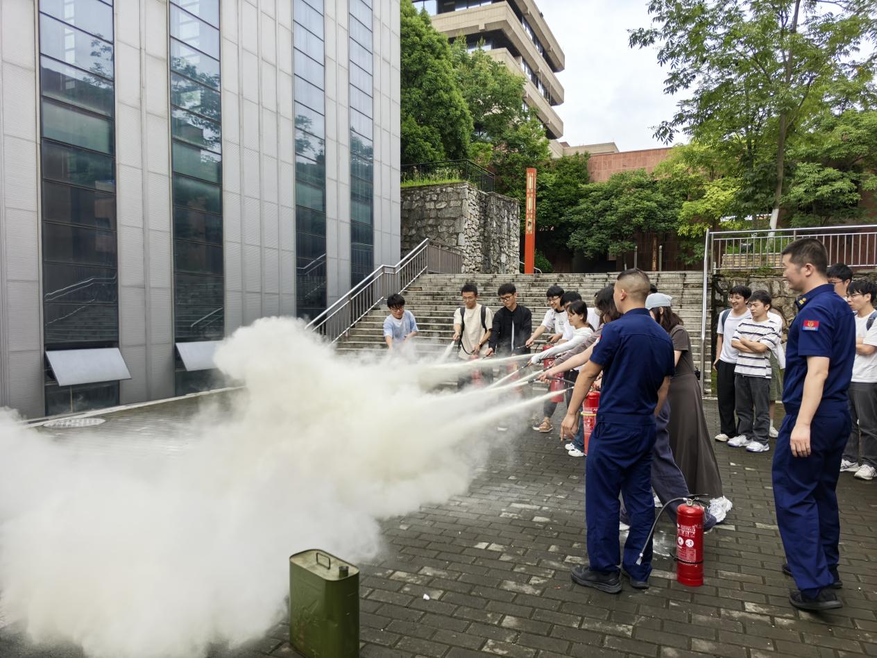 培训现场还组织同学们开展了应急演练,通过以灭火器的使用为例,巩宇峰、秦荣东演示了灭火器的使用步骤:一看、二提、三拔、四瞄、五压喷,指导了同学们使用灭火器扑灭模拟火源,从准确判断风向、与火源保持安全距离,到拔保险销、握住喷管、对准火焰根部按压喷射,同学们准确掌握了灭火器的使用方法。