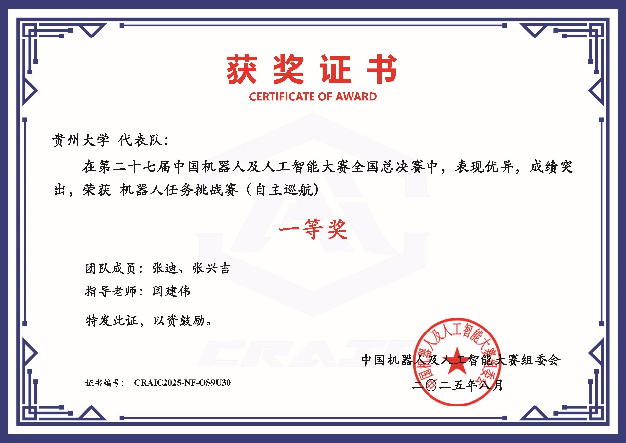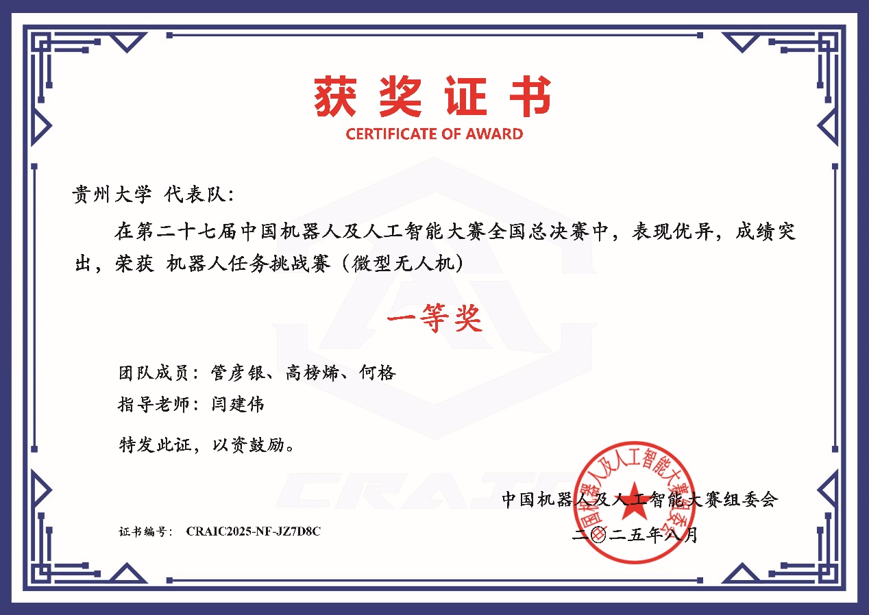 williamhill英国官网各参赛队伍成员和指导老师经历了长达半年多的辛苦备赛,经过校、省、全国总决赛层层选拔和激烈角逐最终在2025年8月3日到8月22日举行的第27届CRAIC中国机器人及人工智能大赛全国总决赛中取得国赛一等奖3项、国赛二等奖8项、国赛三等奖3项,再创williamhill英国官网参加该比赛国赛一等奖数量和获奖总数的历史新高。值得一提的是微型无人机赛道今年是首次参赛,由管彦银担任队长的williamhill英国官网小芯艺艺代表队夺得williamhill英国官网在此赛道中的首个国赛一等奖的好成绩。