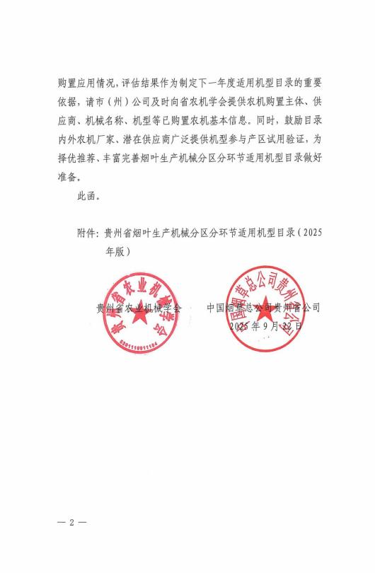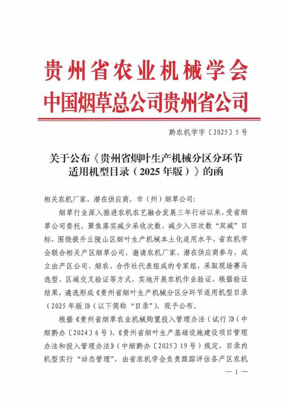 近日,贵州省农业机械学会携手中国烟草总公司贵州省公司,共同发布了《贵州省烟叶生产机械分区分环节适用机型目录(2025年版)》。公司张富贵教授领衔的山地智能农机团队成员参与其中,历时半年完成。